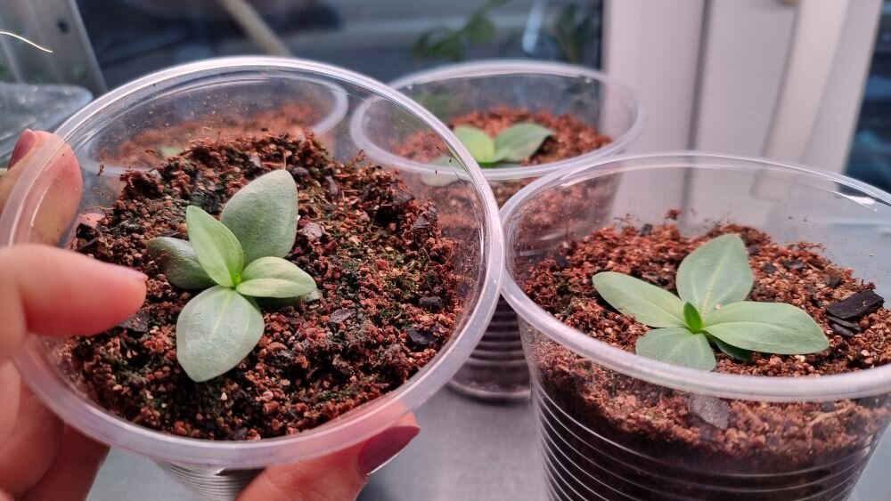 На данный момент, спустя 48 дней с момента всходов, рассада эустомы демонстрирует уже 4-ю пару листьев и достигает диаметра 5-6 см. Ускорение роста произошло после пикировки — 18 дней назад растения были посажены в рассадные стаканы. Второй партии эустомам 32 дня, и они готовы к пикировке по отдельным стаканчикам, так как корешки уже видны на дне емкости.