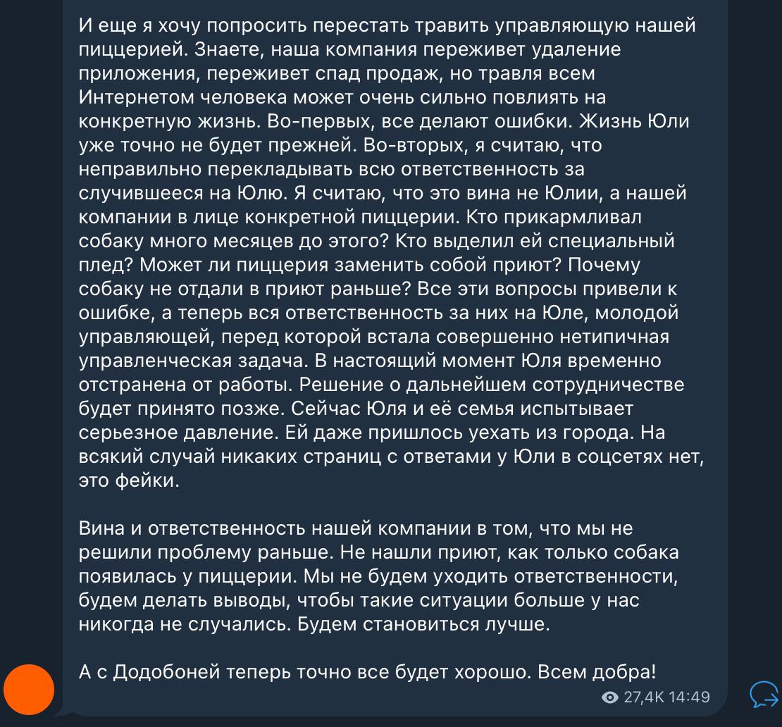 Основатель «Додо Пицца» Федор Овчинников выступил с заявлением после инцидента с дворнягой Додобоней в Челябинске, который спровоцировал массовую отмену сети в соцсетях.