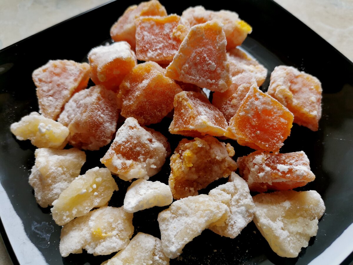 На завершающем этапе цукаты выкладываются на противень и оставляются сохнуть. Чтобы ускорить процесс, можно использовать духовой шкаф на низкой температуре. После того, как они немного подсохнут, их обваливают в сахарной пудре и крахмале. Теперь готовы к употреблению, цукаты прекрасно подойдут как для чаепития, так и в качестве добавки к другим десертам.