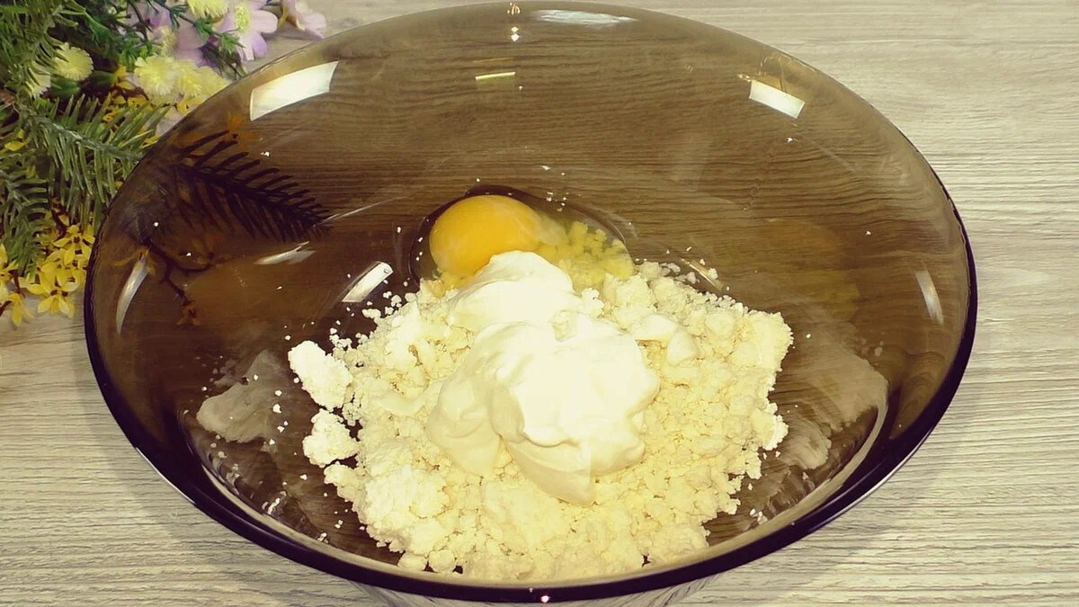 В глубокой миске смешивают яйцо, творог, щепотки соли и сахара. В эту массу добавляется сметана, и всё тщательно перемешивается. При использовании данного количества ингредиентов получится одна большая лепешка диаметром около 26 см.