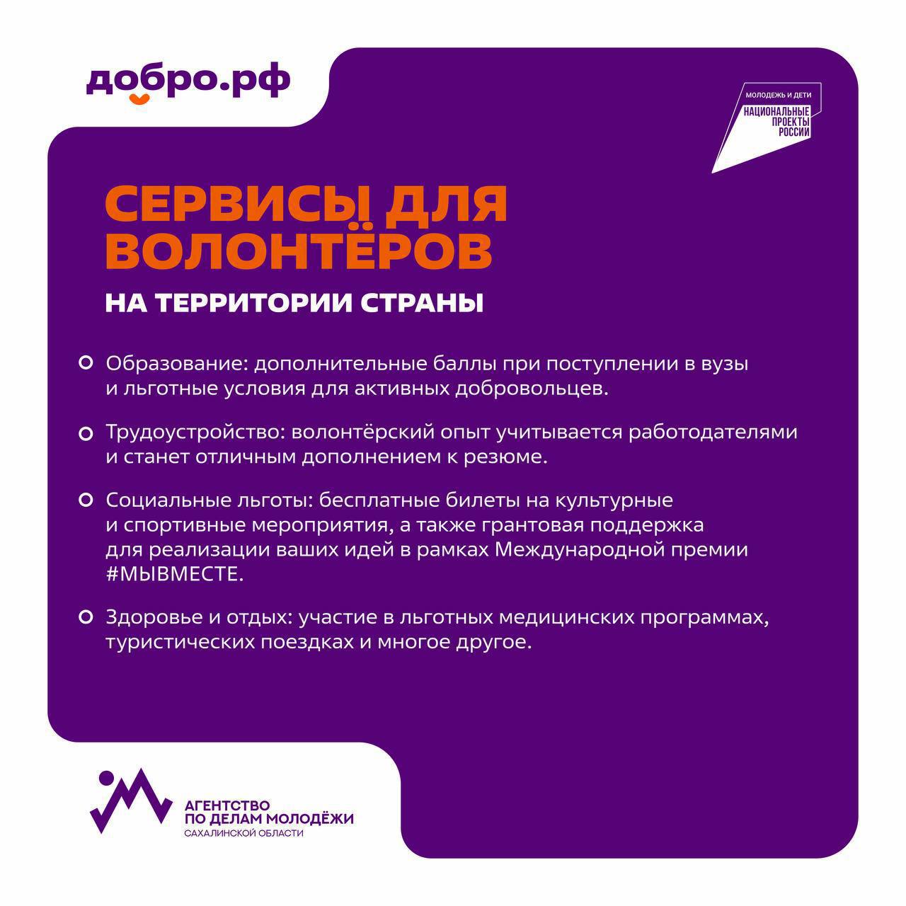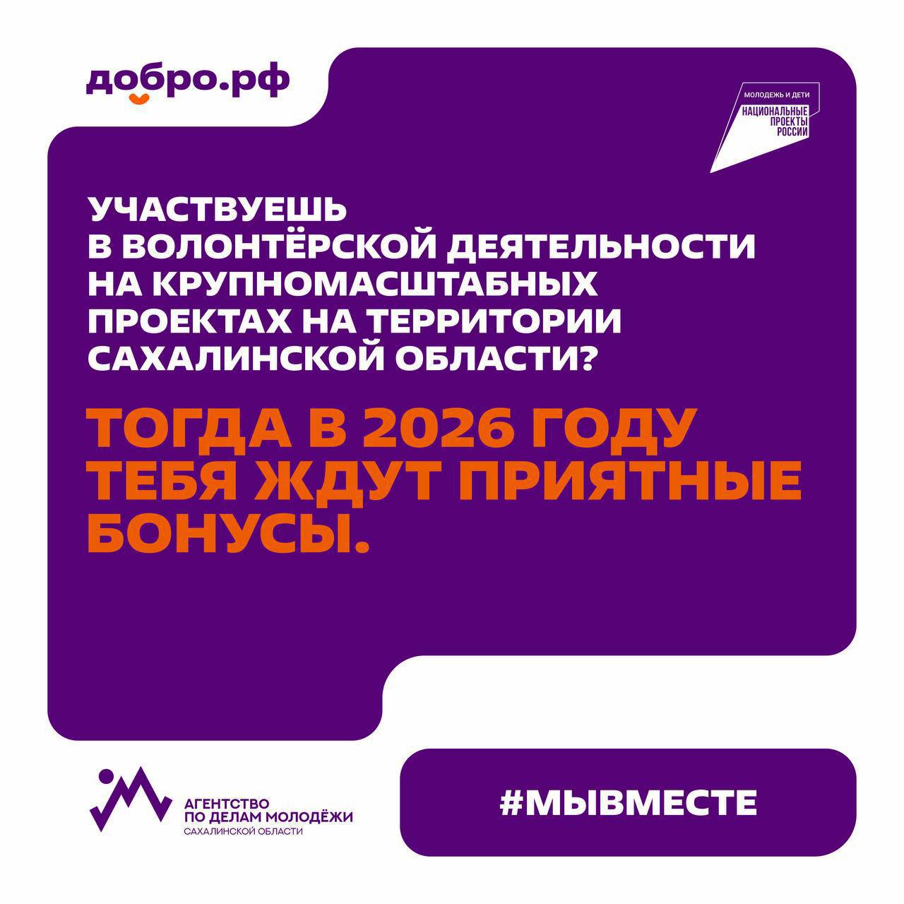 Для волонтеров, участвующих в крупных проектах на территории Сахалинской области, в 2026 году предусмотрены дополнительные сервисы и льготы.