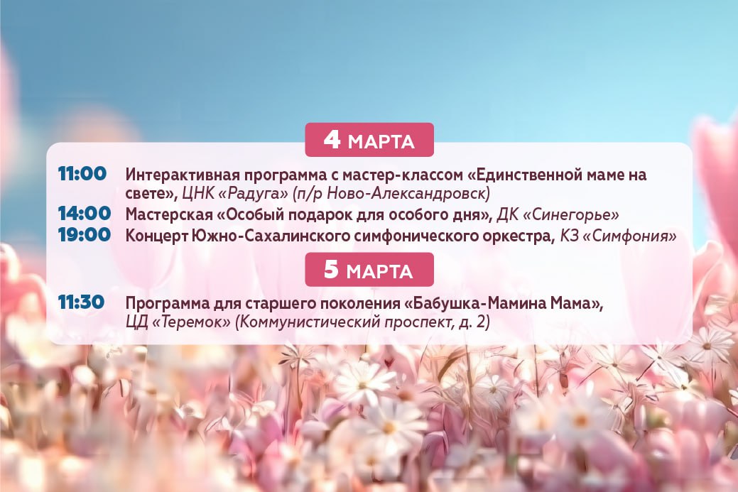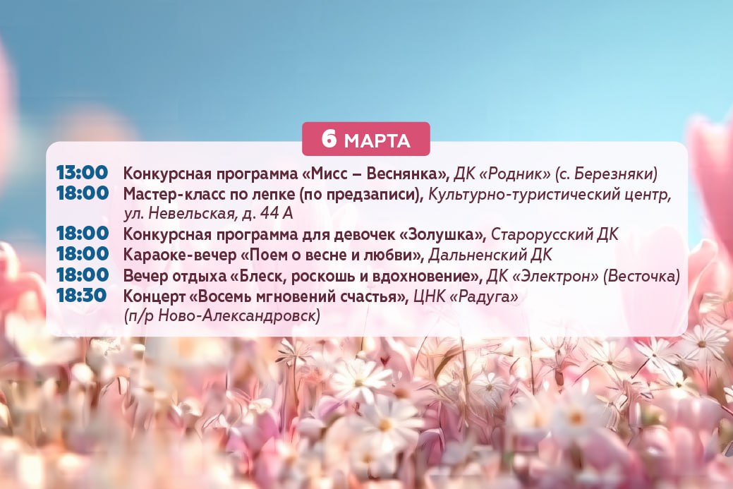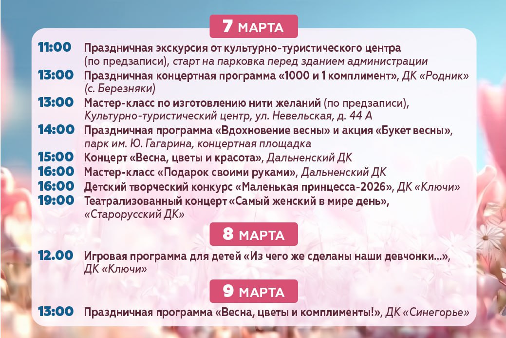 Напоминаем, что праздничная программа 8 марта охватит не только центр, но и планировочные районы. Подготовили для вас подборку мероприятий – сохраняйте афишу и проводите выходные с близкими.