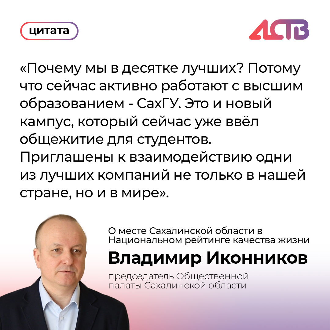 Сахалинская область вошла в топ-5 Национального рейтинга качества жизни АСИ по уровню качества жизни. Благодаря чему это стало возможным, astv.ru спросил председателя Общественной палаты Сахалинской области Владимира Иконникова.