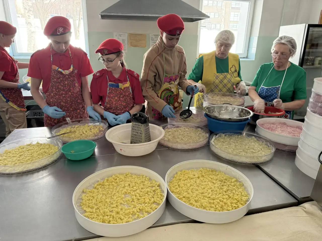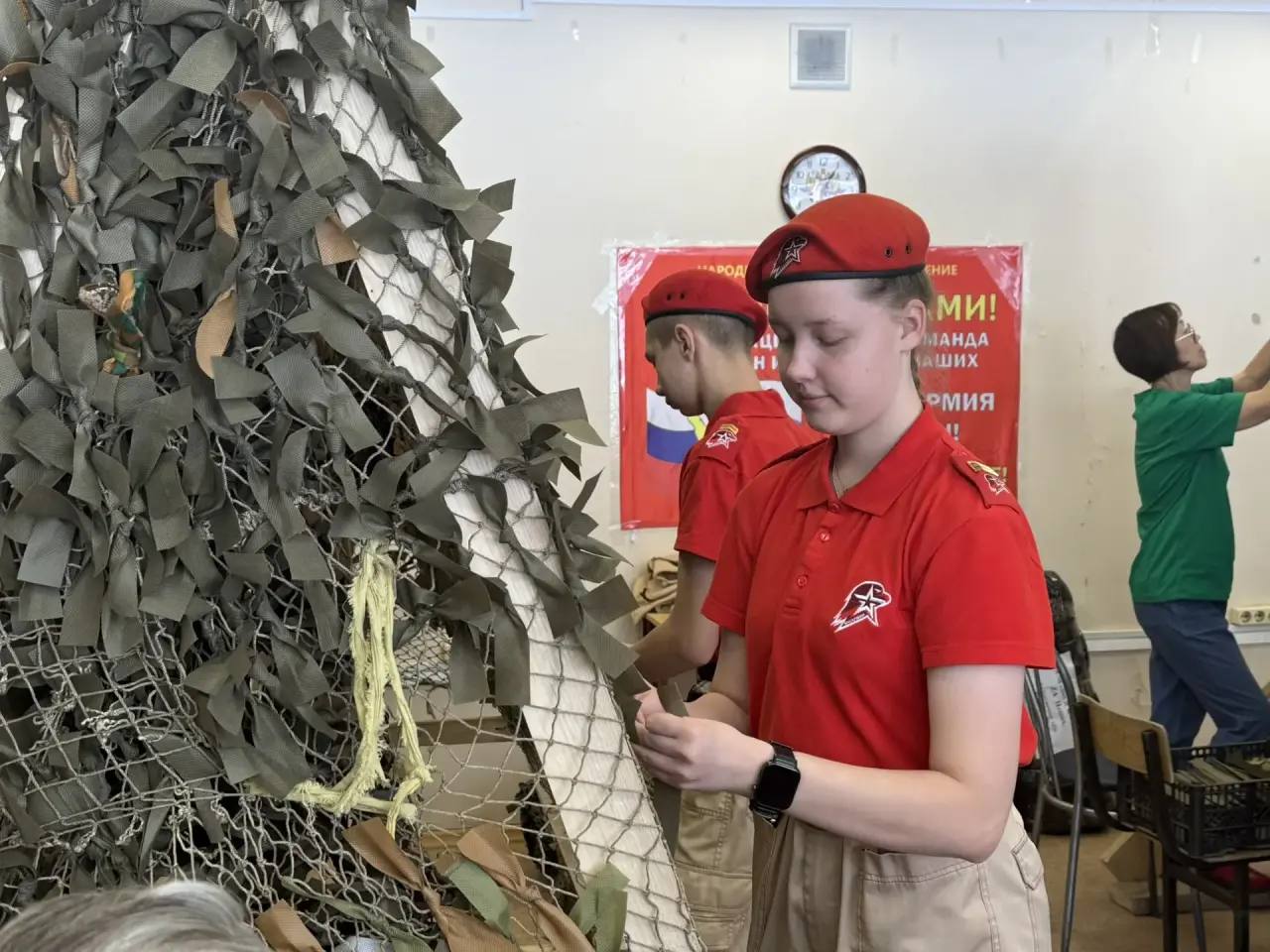 А это значит - берут ленты определенной расцветки: коричневой и зеленой. Размер одной сети может скрыть площадь 6 на 12 метров. Чтобы сплести такую - нужно несколько дней непрерывной работы. Параллельно волонтеры, а также участники «Юнармии» изготавливают окопные свечи, сухой душ, готовят «Обеды для Победы»: это супы, каши, сладости, чаи.