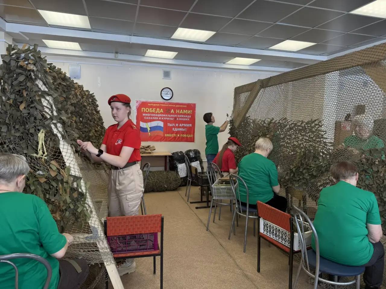 Островные волонтёры готовят маскировочные сети для военных на весенне-летний сезон.