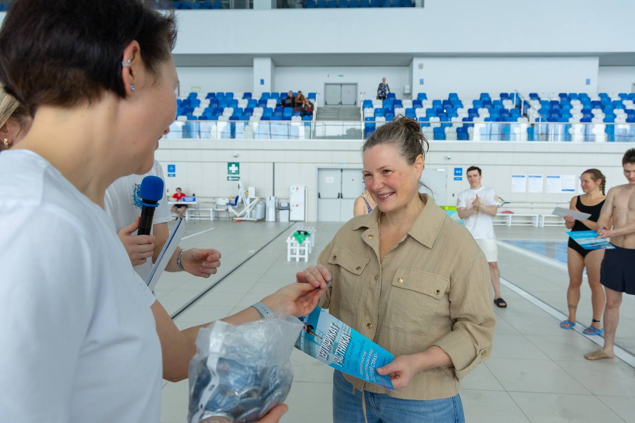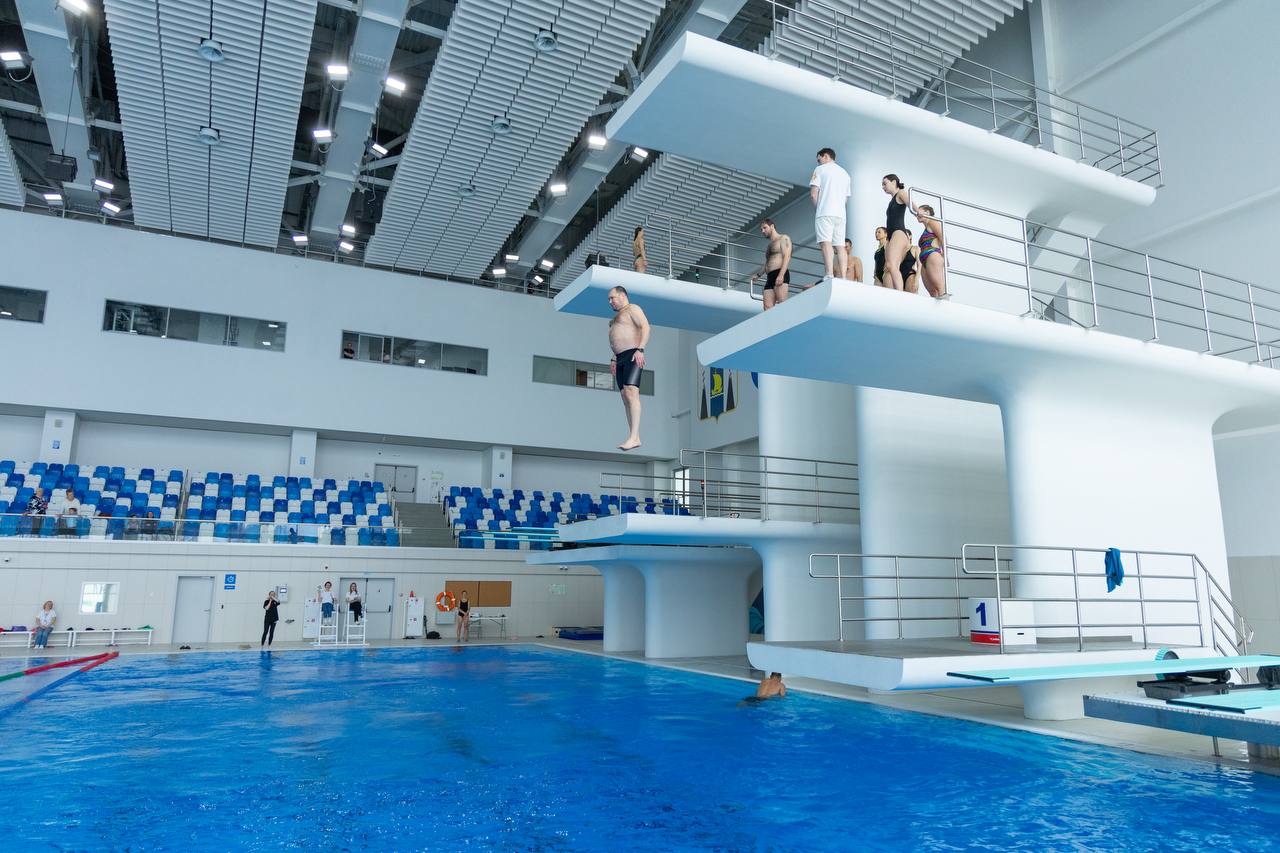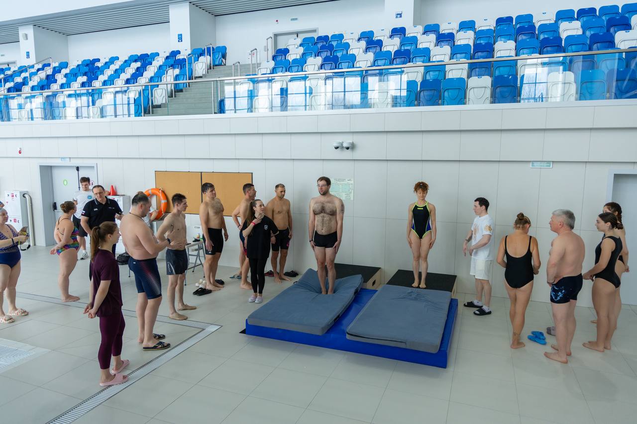 После разминки на суше и теоретических знаний, которые дали Мастера спорта международного класса по прыжкам в воду - Сергей Назин и Ульяна Клюева, добровольцы отправились покорять вышки 1 м, 3, 5, 7,5 м и 10 м.