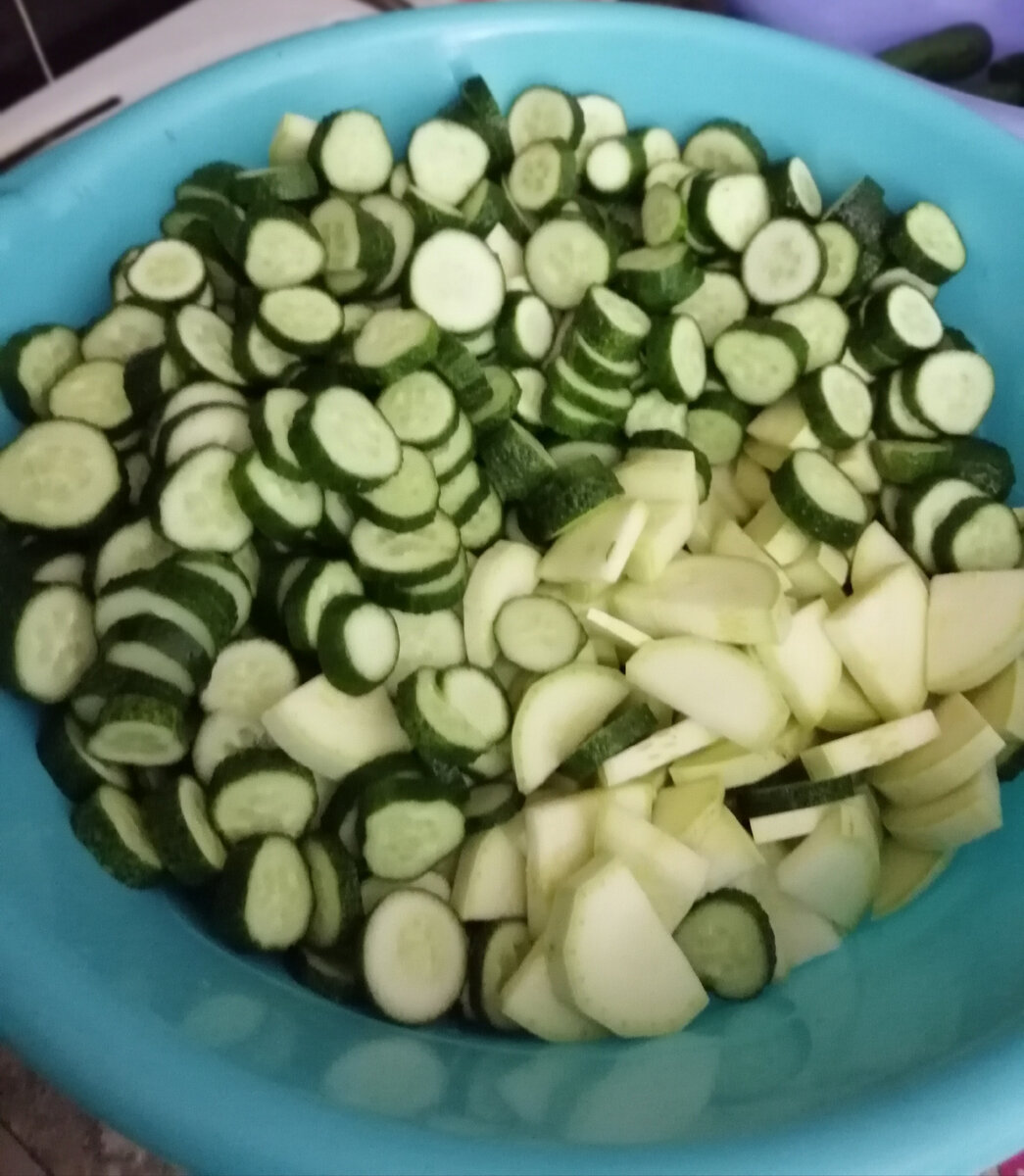 - Нарезать огурцы и кабачки: кольцами или полукольцами в зависимости от предпочтений.