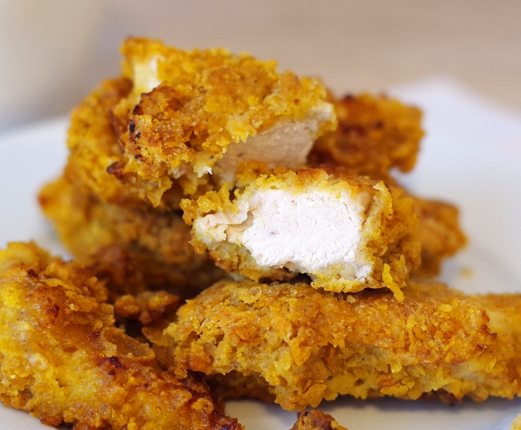4. Обмакните каждую полоску куриного филе в тесто, затем тщательно обваляйте в подрыхленных кукурузных хлопьях.