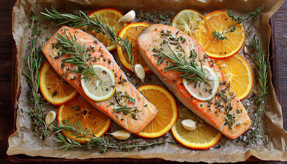 Подавайте лосось прямо на ломтиках цитрусовых, полив образовавшимся соком. Это блюдо не требует сложных соусов — оно самодостаточно и прекрасно звучит в лёгком, свежем исполнении.