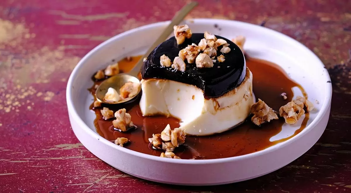 Шаг 6: Выньте панакоту из холодильника и на 30 секунд погрузите формочки в горячую воду. Аккуратно переверните на тарелки, полейте кофейным сиропом и посыпьте пралине.