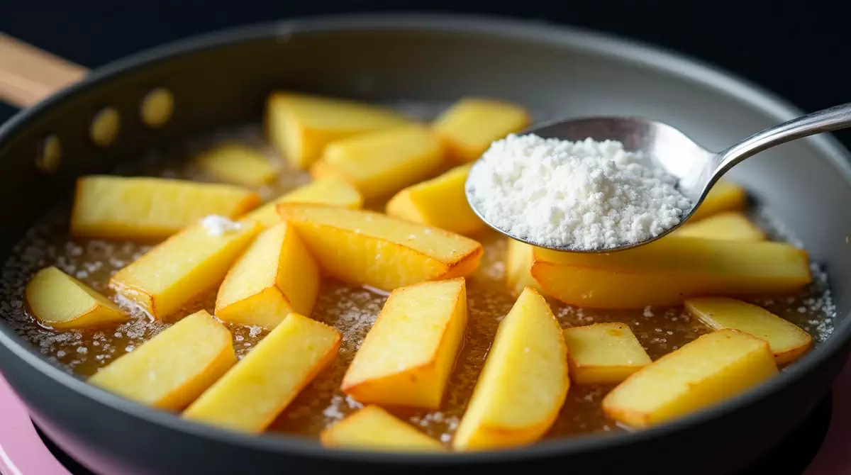 Тем временем на плите разогревается широкая сковорода, в которую наливается достаточное количество растительного масла. Как только масло достигнет нужной температуры, добавляется столовая ложка пшеничной муки и немного куркумы для создания ароматной и золотистой панировки. Быстро размешав смесь, можно приступать к жарке картофеля.