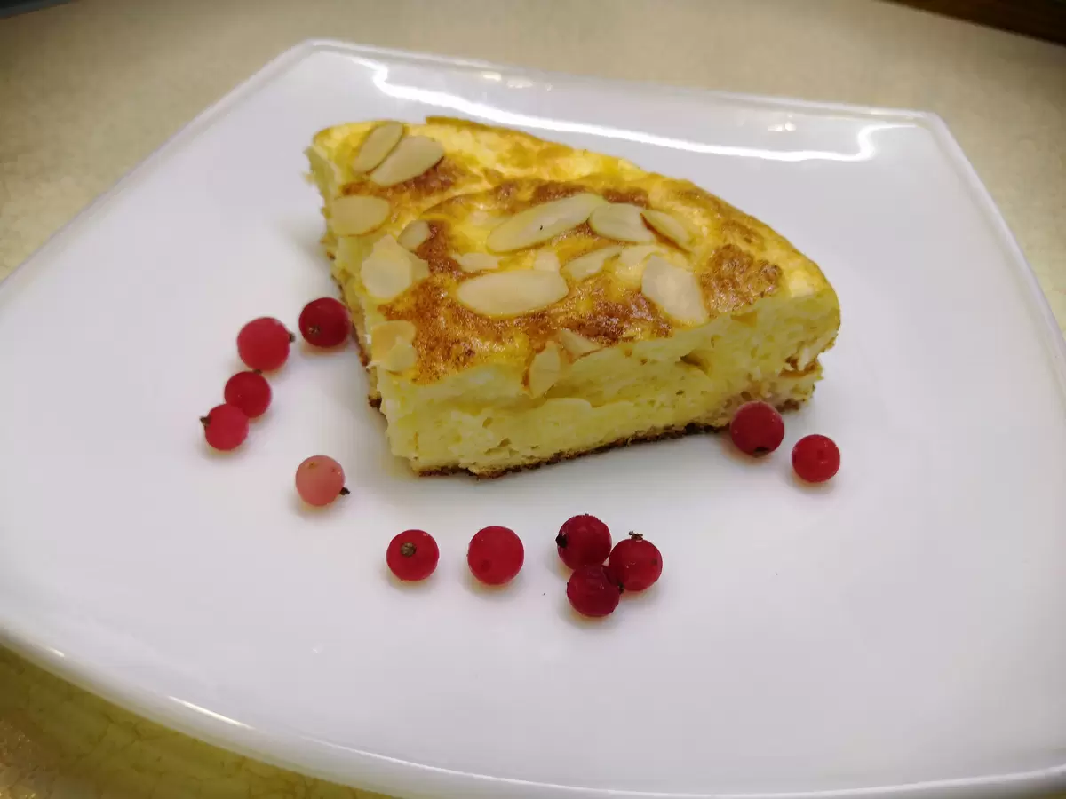 Полученную массу выложите в подготовленную форму для запекания (силиконовая форма диаметром 15 см идеально подойдет). Сверху аккуратно посыпьте миндальными лепестками. Выпекайте в заранее разогретой до 180 градусов духовке в течение 25-30 минут. Время готовки может варьироваться в зависимости от вашей духовки. Обратите внимание: по мере остывания запеканка может немного осесть, но это не скажется на ее вкусе.