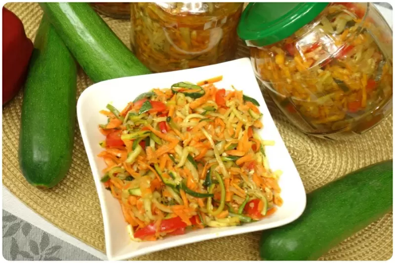 Для начала кабачки и морковь следует натереть на специальной терке, предназначенной для моркови по-корейски. Лук нарезать полукольцами, а чеснок — мелко. Все подготовленные ингредиенты соединяются в широкой кастрюле, добавляя последним уксус. Полученную массу следует тщательно перемешать и оставить мариноваться в прохладном месте на 4–6 часов, а лучше на ночь.