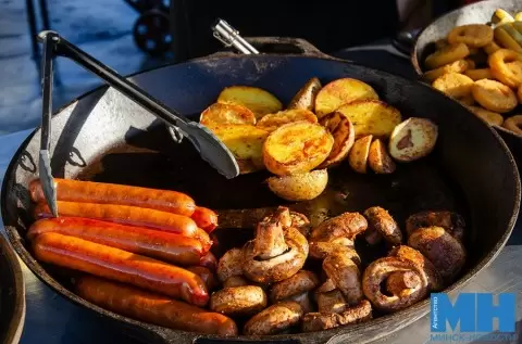 Ярмарка привлекает не только сладкоежек, но и любителей сытной еды. В меню представлены блюда белорусской кухни, такие как солянка, борщ, а также шашлык и вареная кукуруза. Посетители могут насладиться глинтвейном, который предлагается в различных вариантах — от мятного до клубничного, а также другим теплым напиткам, чтобы согреться в холодные зимние вечера.