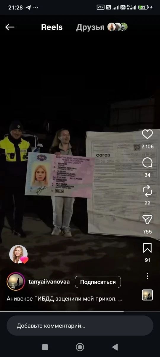 Девушка по имени Татьяна опубликовала на своей странице в Instagram* шуточный ролик. Ее автомобиль остановили для проверки документов. Сахалинка предъявила инспекторам права и страховку впечатляющего размера.