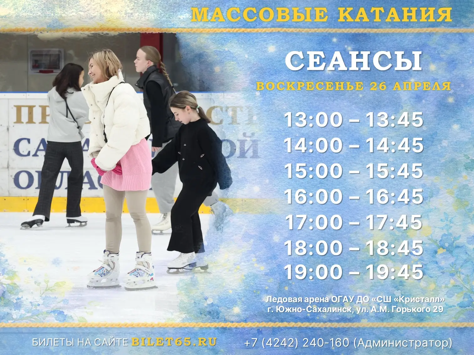 Вас ждёт первоклассный лёд, уютная атмосфера и лёгкая музыка для комфортного катания. Для гостей открыт прокат коньков, сеансы - каждый час с перерывами на обновление льда