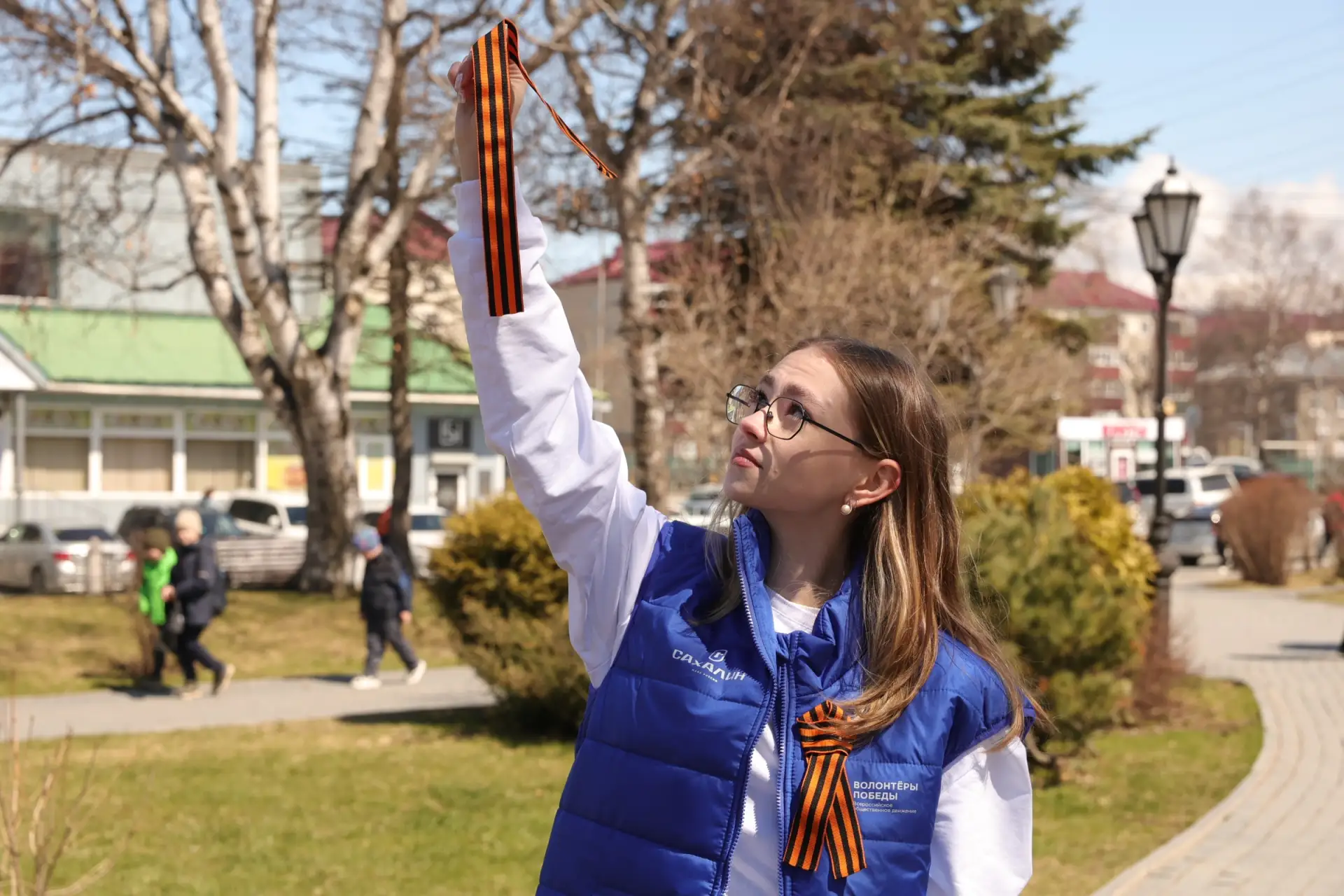 Волонтёры уже начали раздавать ленты — символ уважения к подвигам защитников Отечества. В Южно-Сахалинске ленты выдали возле сквера у областной библиотеки и на территории ТК «Янтарь».