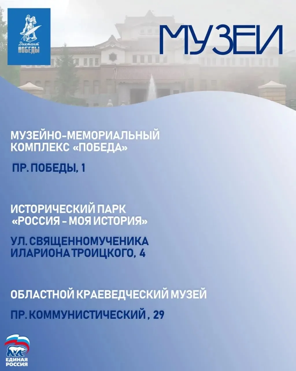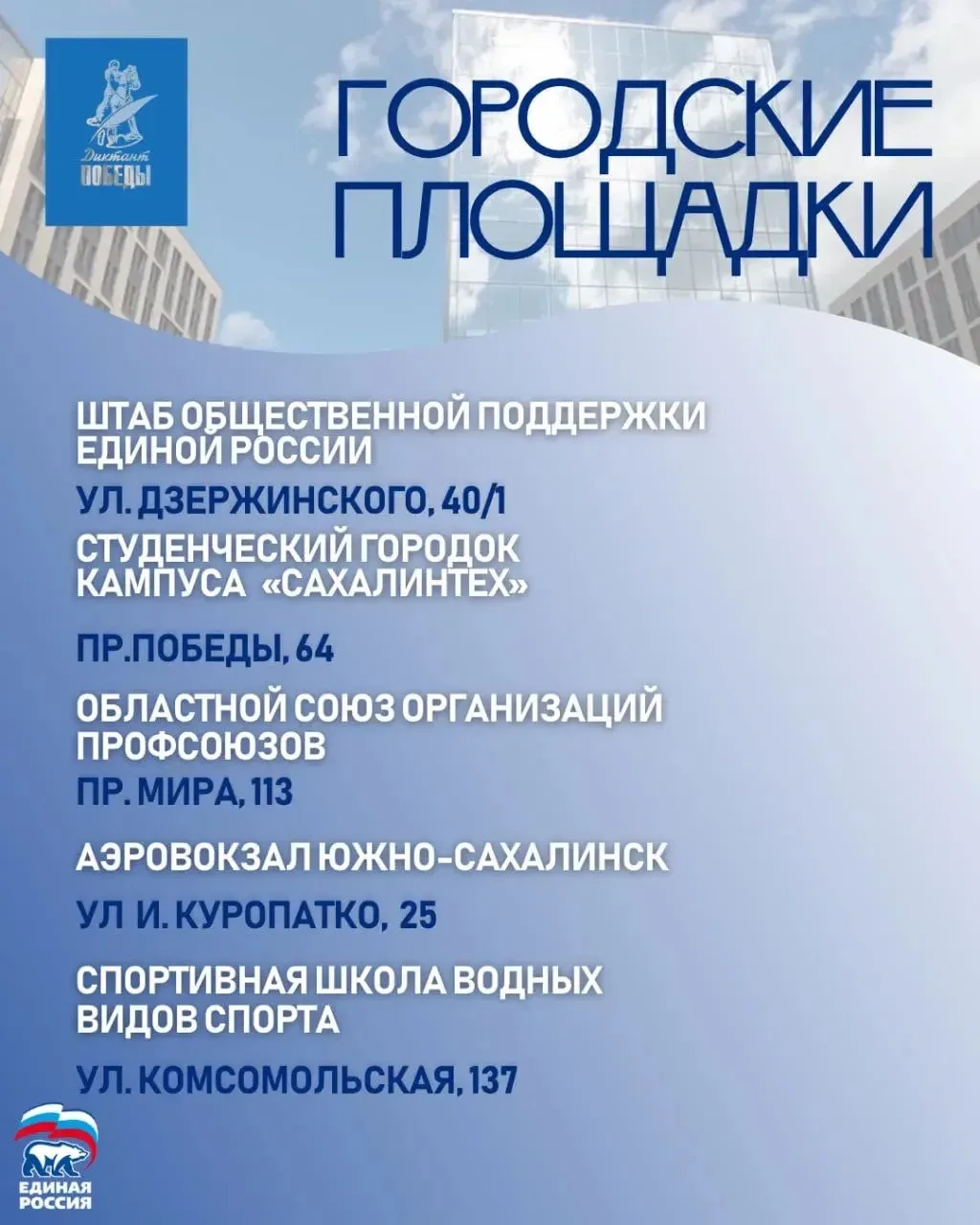 Организаторы акции – Единая Россия, – постарались сделать участие удобным для всех: от студентов и школьников до трудовых коллективов. Площадки будут работать в домах культуры, музеях, доме профсоюзов, СахГУ, центре «Волна» и даже в аэровокзале. Список площадок, куда может прийти любой желающий – на карточках.