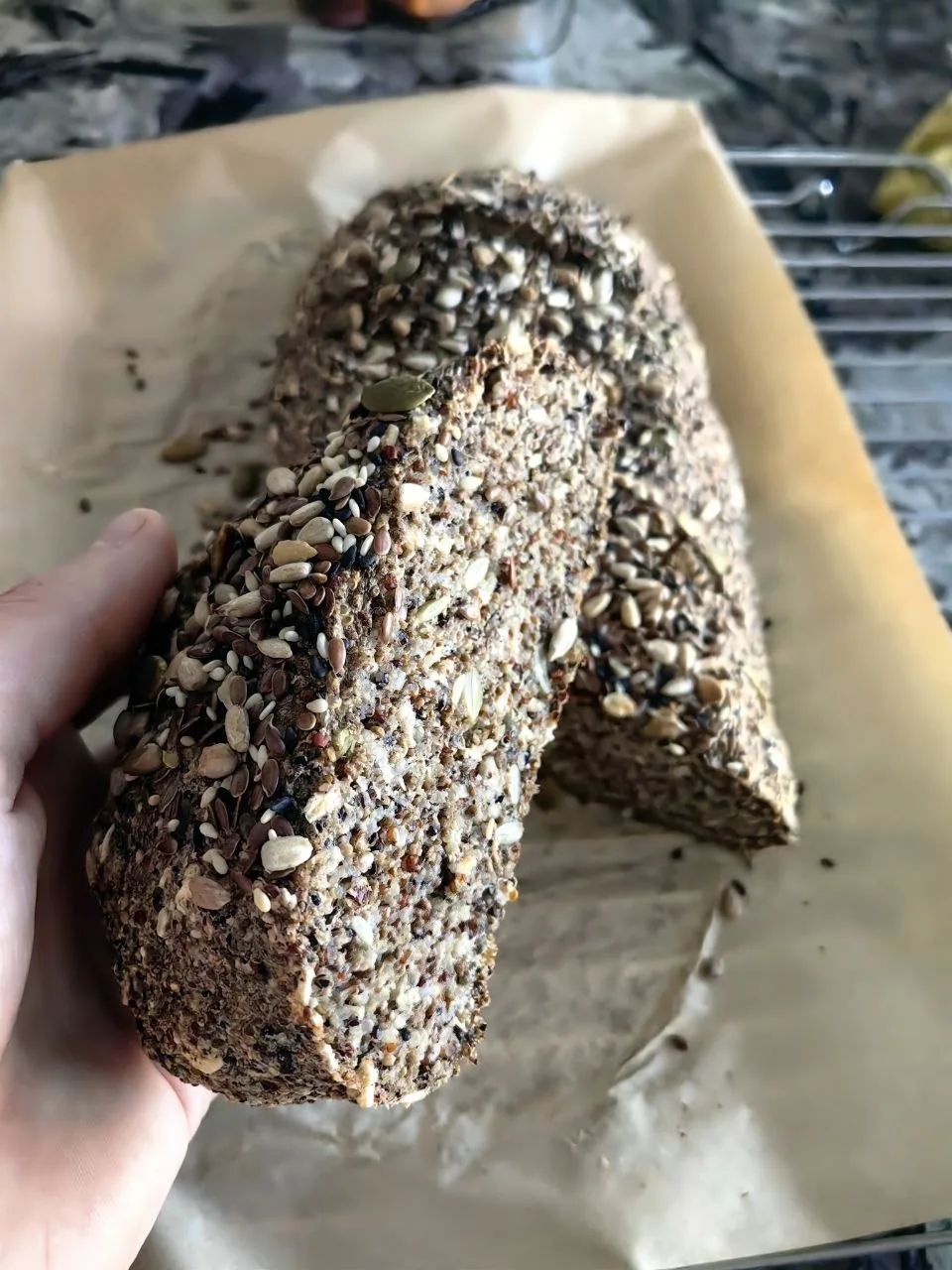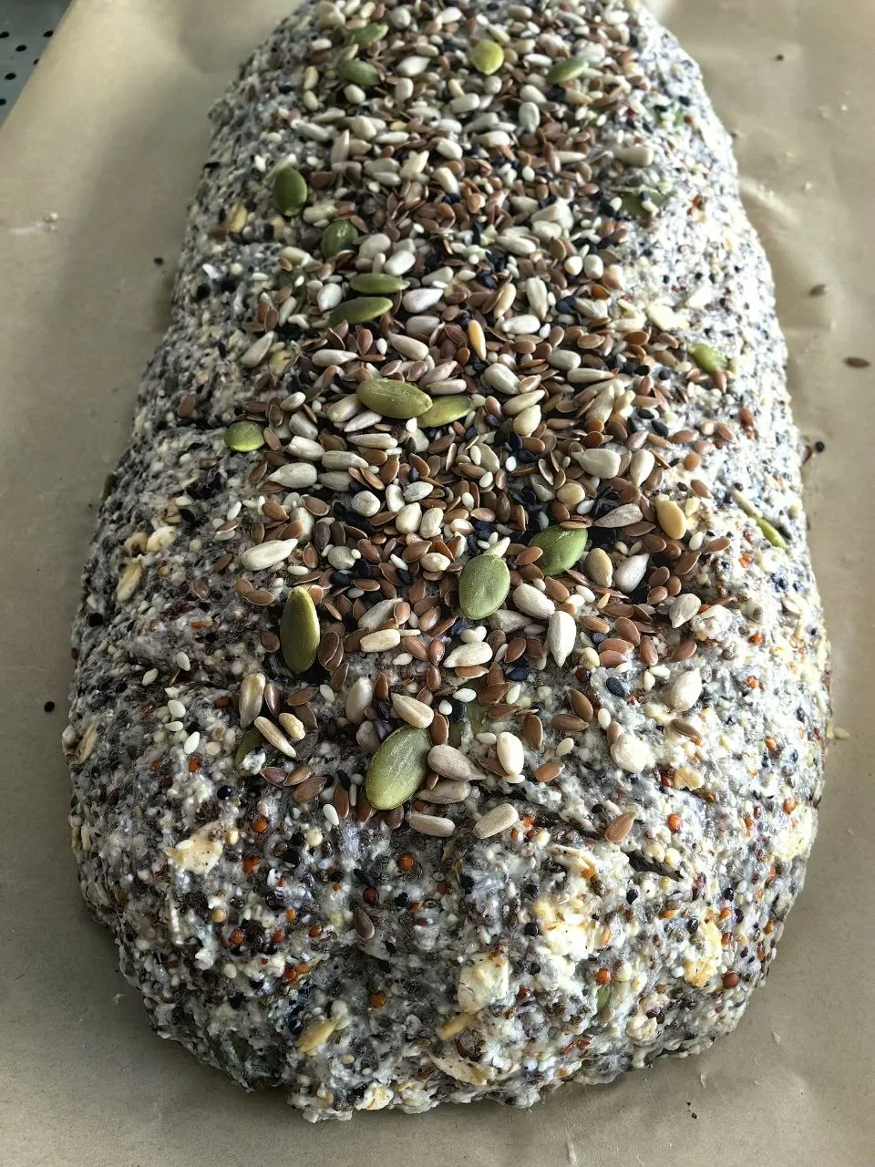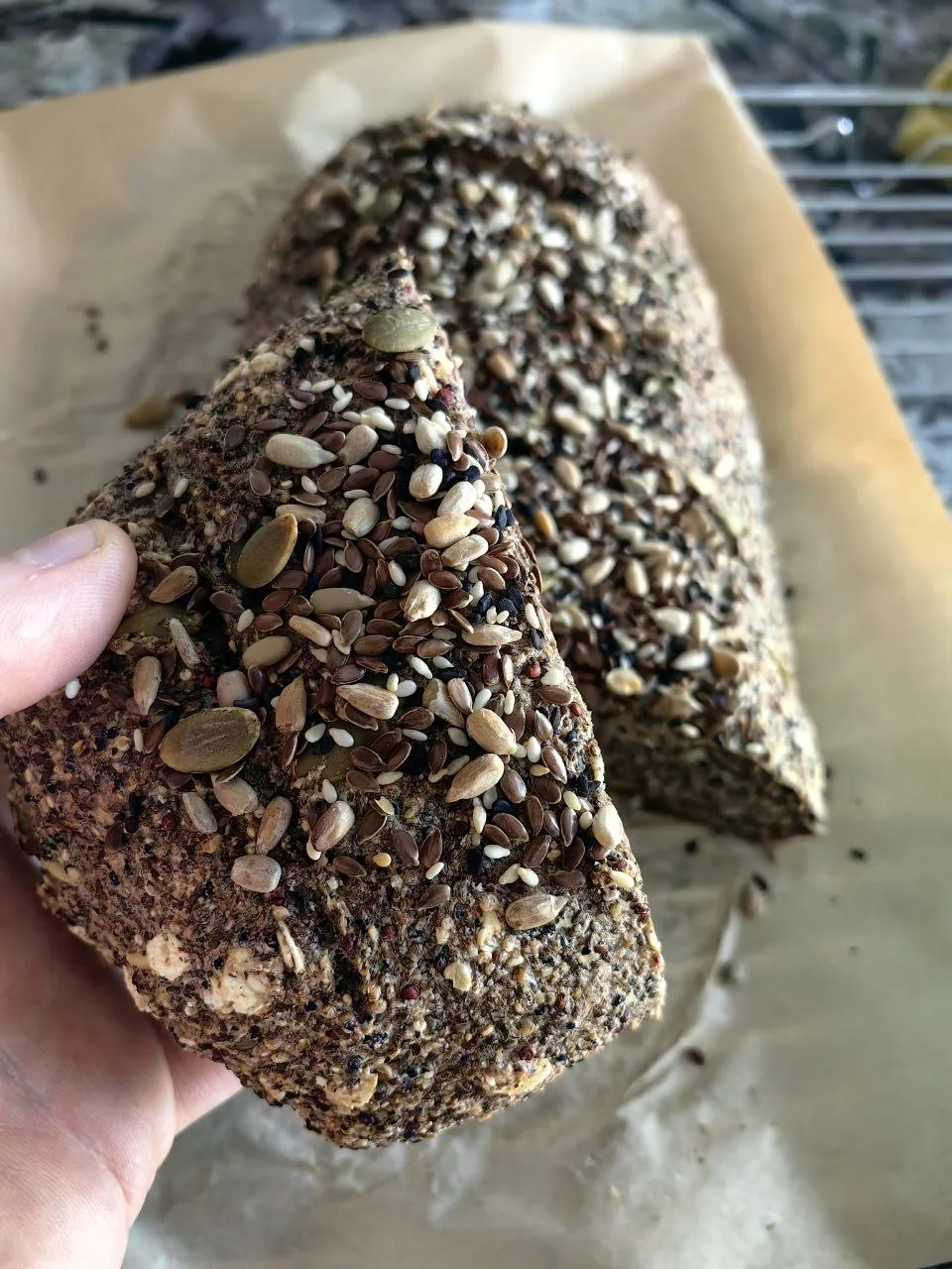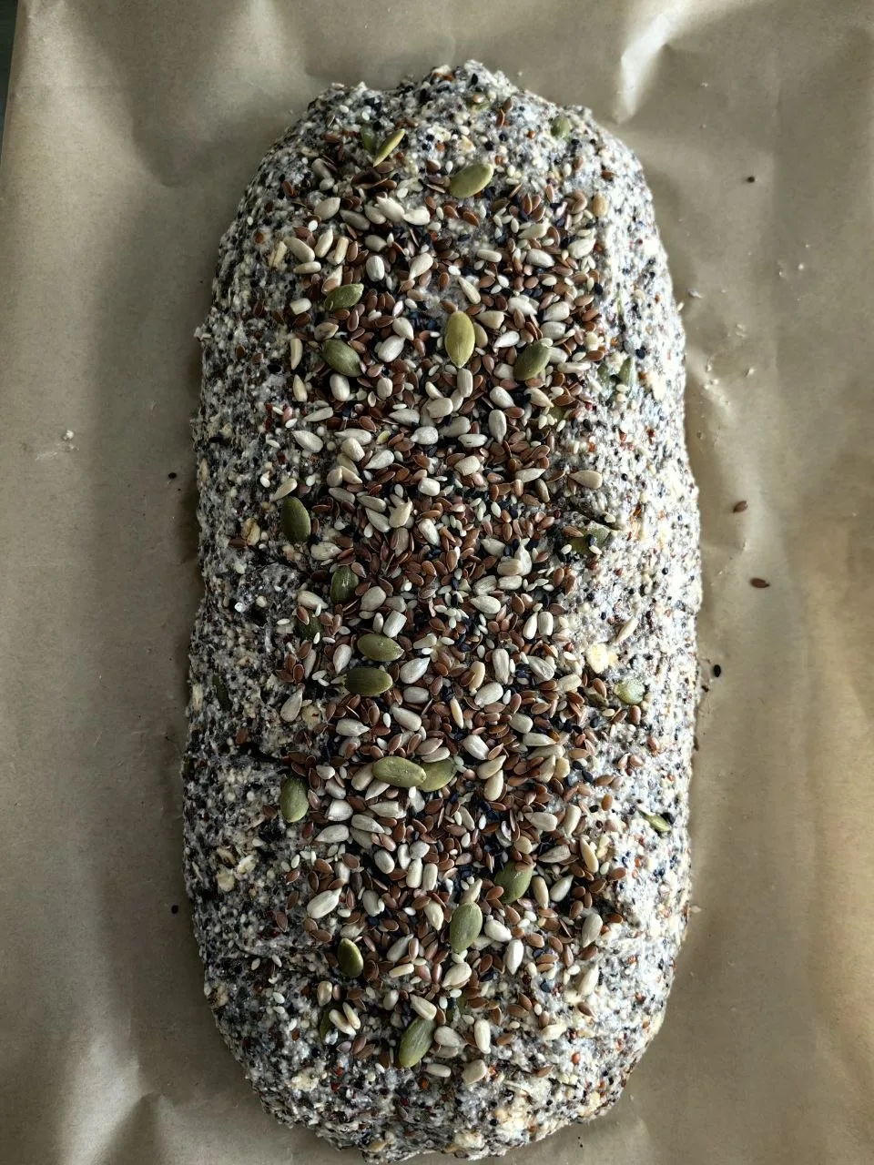 Технология приготовления: киноа и семена чиа объединить и пробить погружным блендером, добавить все остальные ингредиенты. Перемешать, сформировать из теста батон, сверху — насечки и смесь семян (лён, кунжут, подсолнух, тыква). Выпекать при 160 градусах 50 минут. Готовность проверяем деревянной шпажкой. Тесто не должно прилипать. Даем остыть и можно наслаждаться вкусным и полезным хлебом.