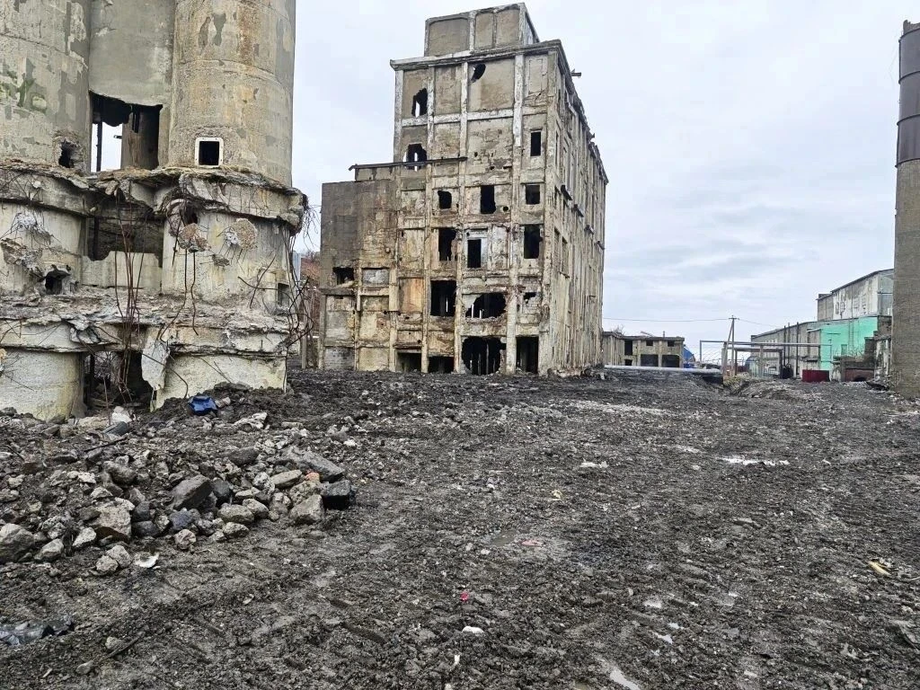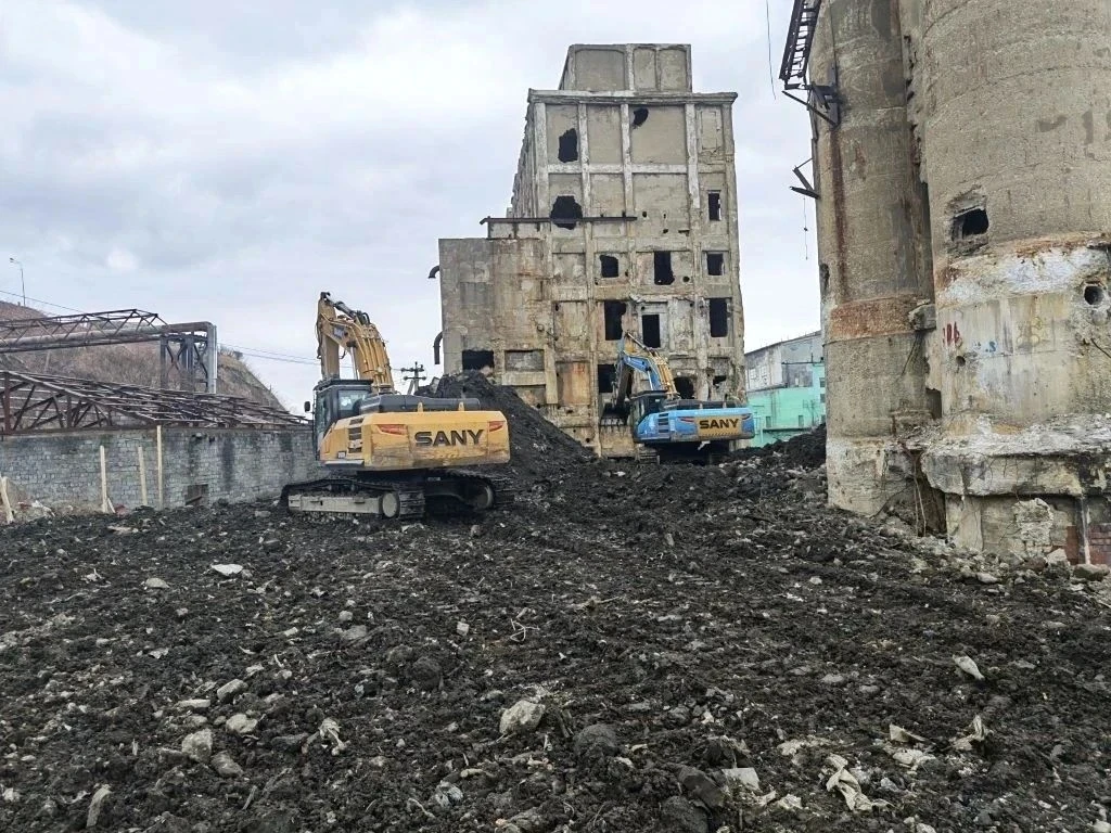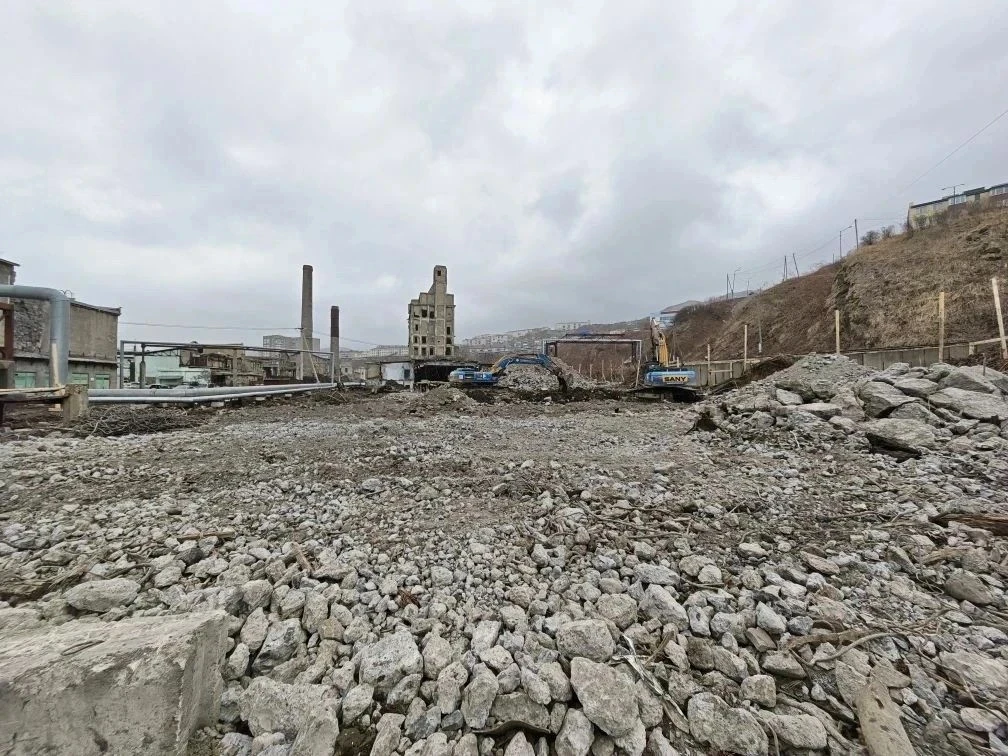 Подрядчик произвел демонтаж строений, сейчас рабочие дробят и перерабатывают железобетон. Осталось снести самые высокие объекты.