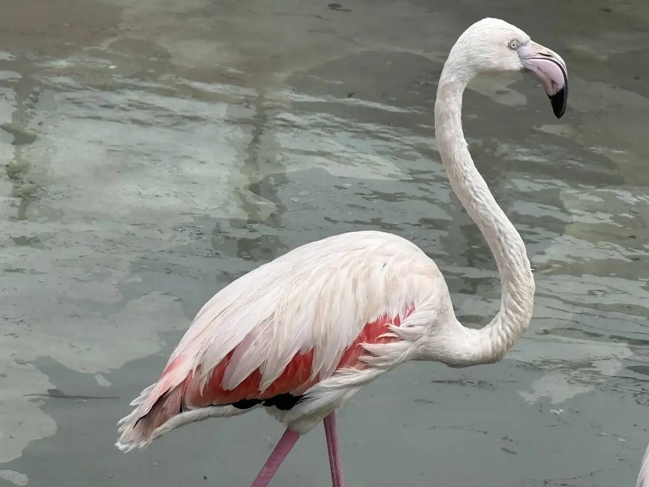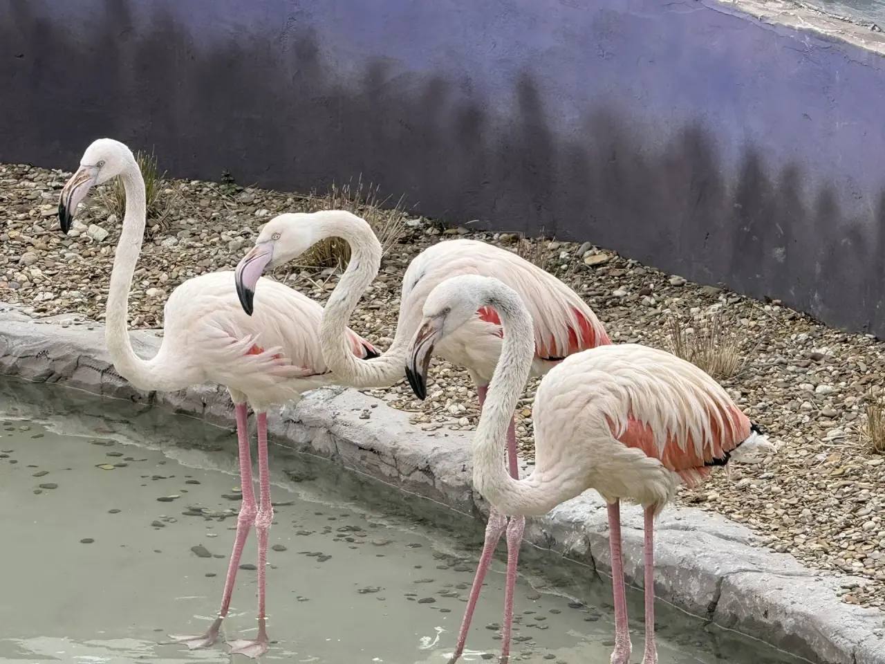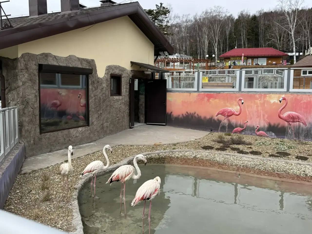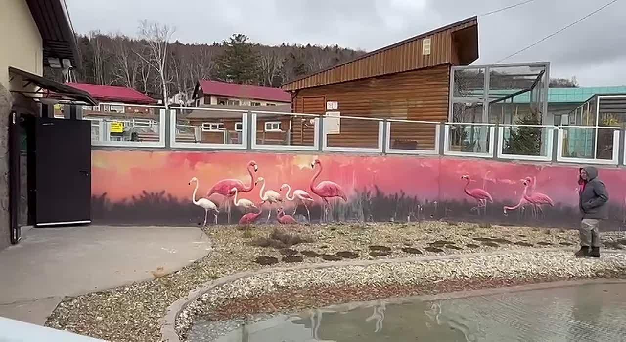 Розовые фламинго в сахалинском зоопарке ждут тепла.