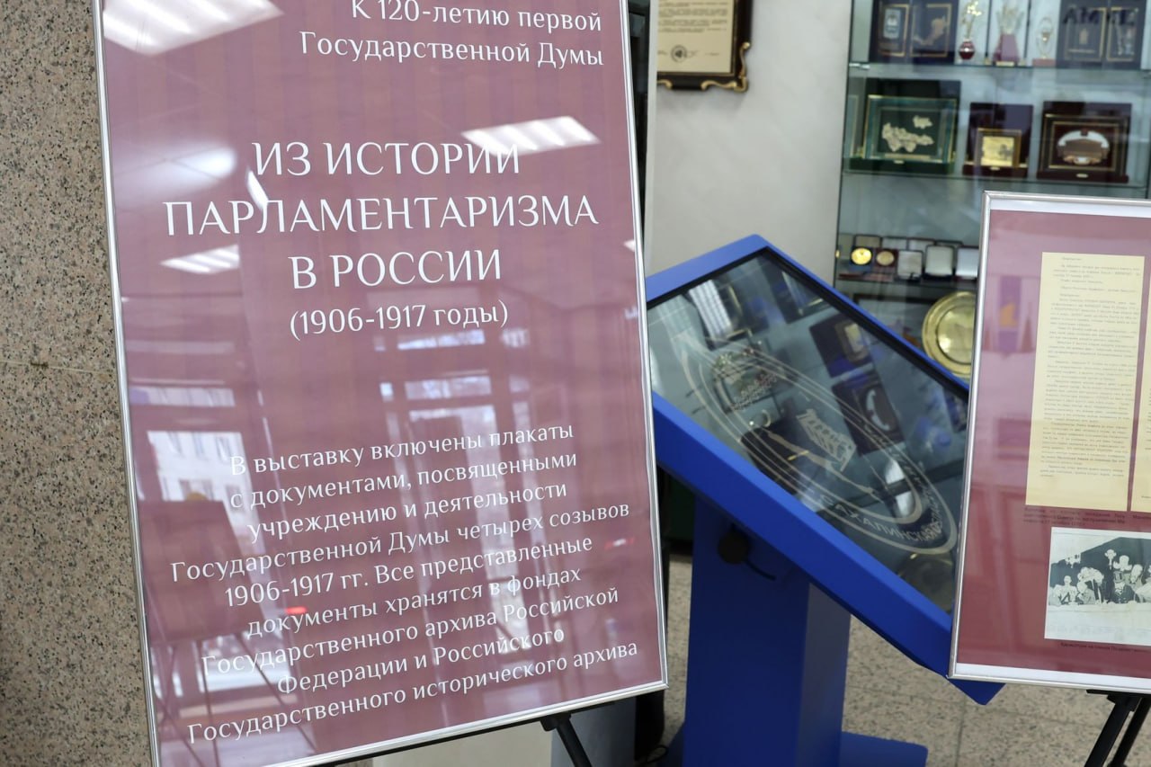 На стендах расположены уникальные копии архивных документов, фотографии и материалы, отражающие эволюцию демократических институтов и преемственность парламентских традиций в нашей стране.