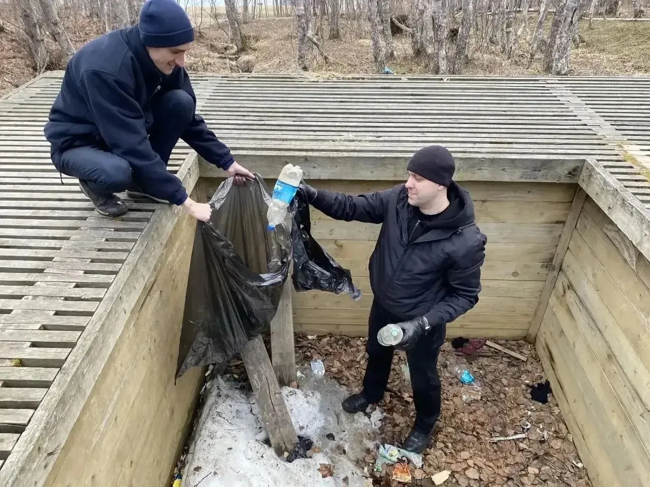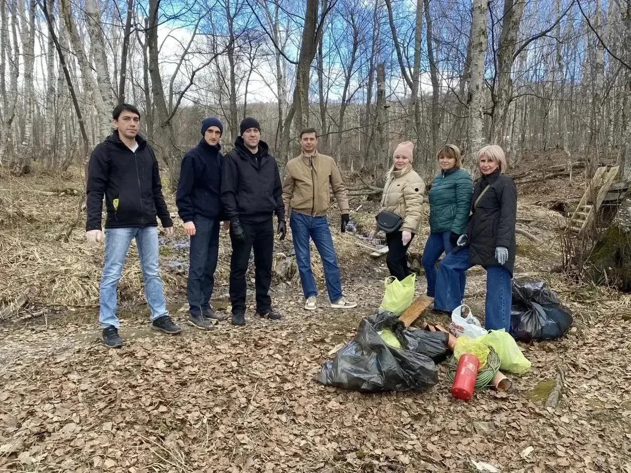 Огнетушитель, залежи бутылок, остатки кабеля и труб нашли в лесах сотрудники сахалинского минтранса и подведомственных учреждений во время субботников