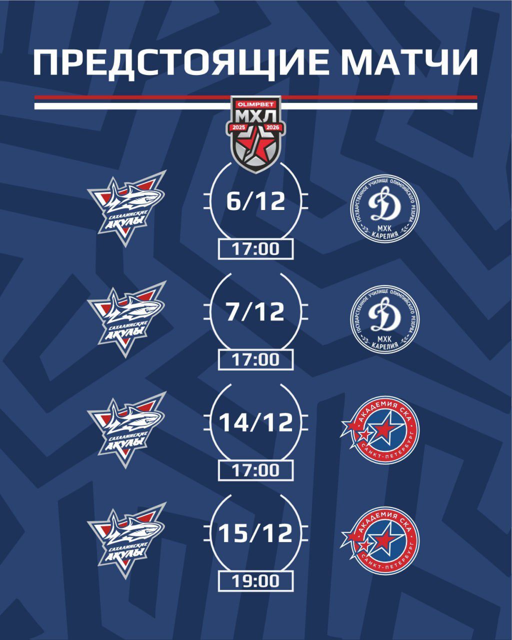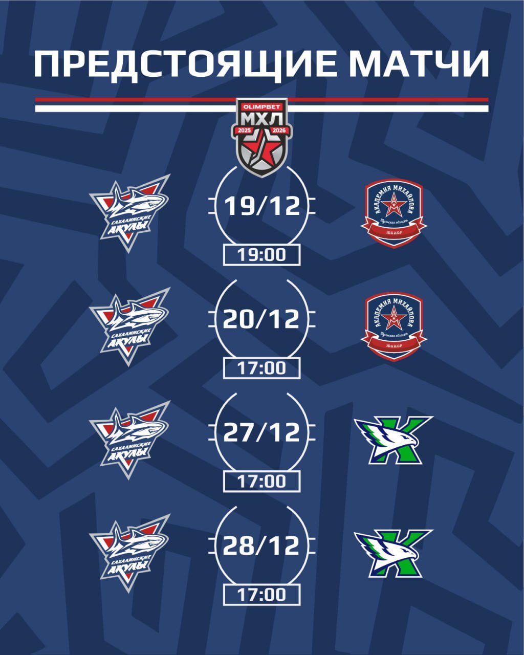 В декабре 2025 года хоккейный клуб «Сахалинские Акулы» проведёт серию домашних матчей в рамках OLIMPBET Чемпионата Молодежной хоккейной лиги. Сахалинскую команду ждут напряжённые и захватывающие игры против конкурентов по Серебряному дивизиону.